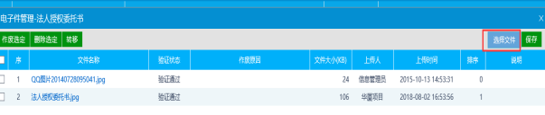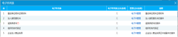 点击上图中页面左上角的“扫描件管理”按钮,进入电子附件上传页面,页面如下图所示,按照要求上传附件(必须上传的电子件:营业执照、诚信承诺书、法人授权委托书)