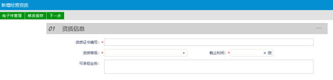 进入经营资质填写页面,如下图所示,填写操作流程和前面的基本信息类似(填写信息保存,上传电子件,并提交)